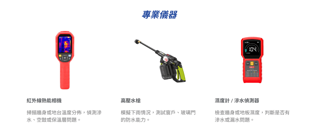 – 技師到場檢查牆身、地台、窗框、水電、潔具、門窗密封等重點項目