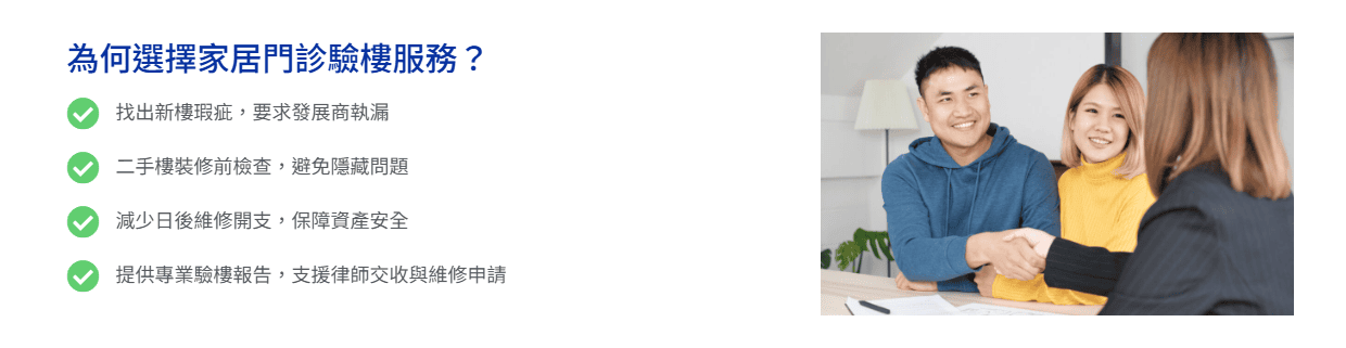 專業驗樓新盤單位,發現瑕疵即時執漏,保障收樓品質與入住安心。
