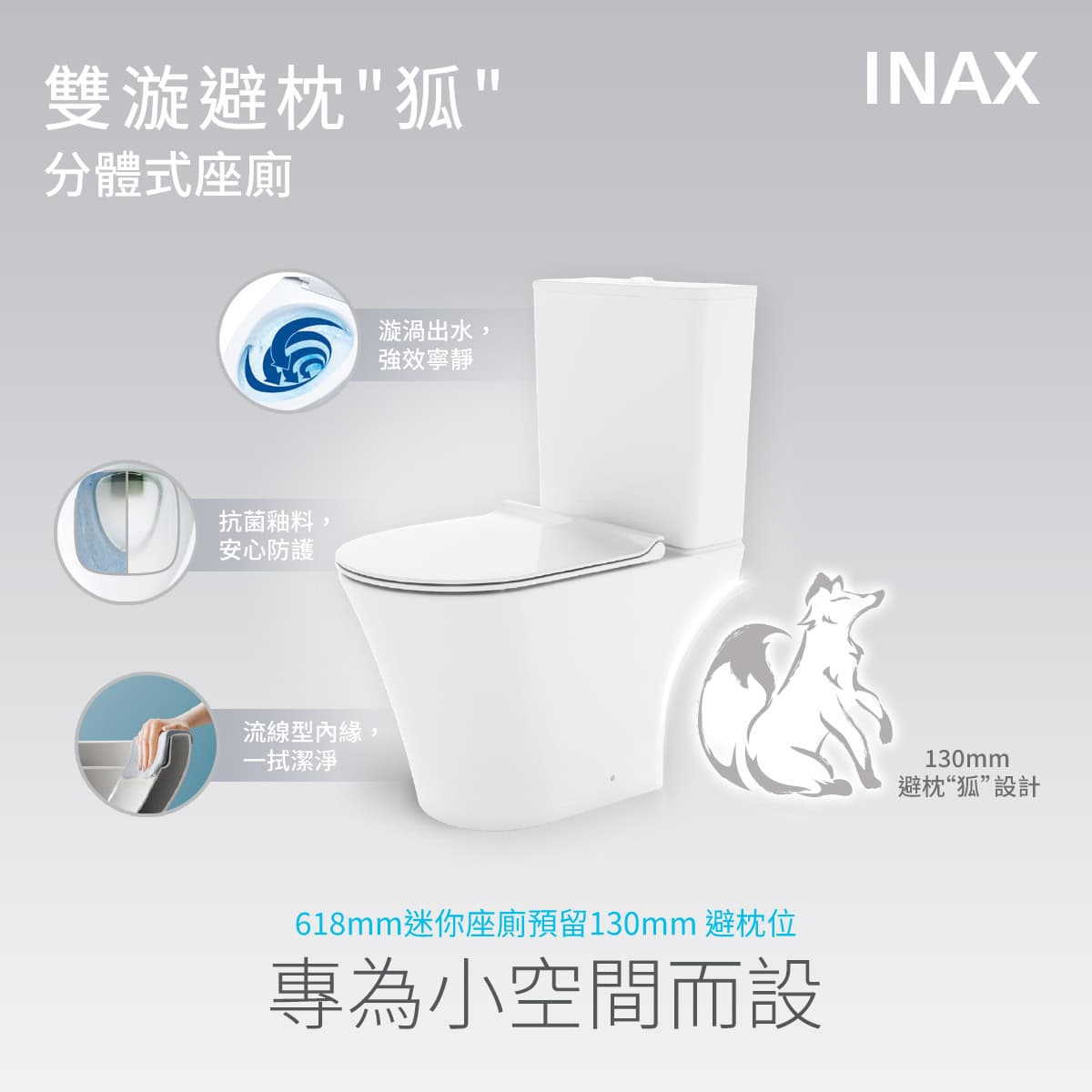 「雙漩避枕“狐”分體式座廁」,以精算狐形曲線預留130mm空間,巧妙避開喉管,令窄小的浴室空間從此寬闊。