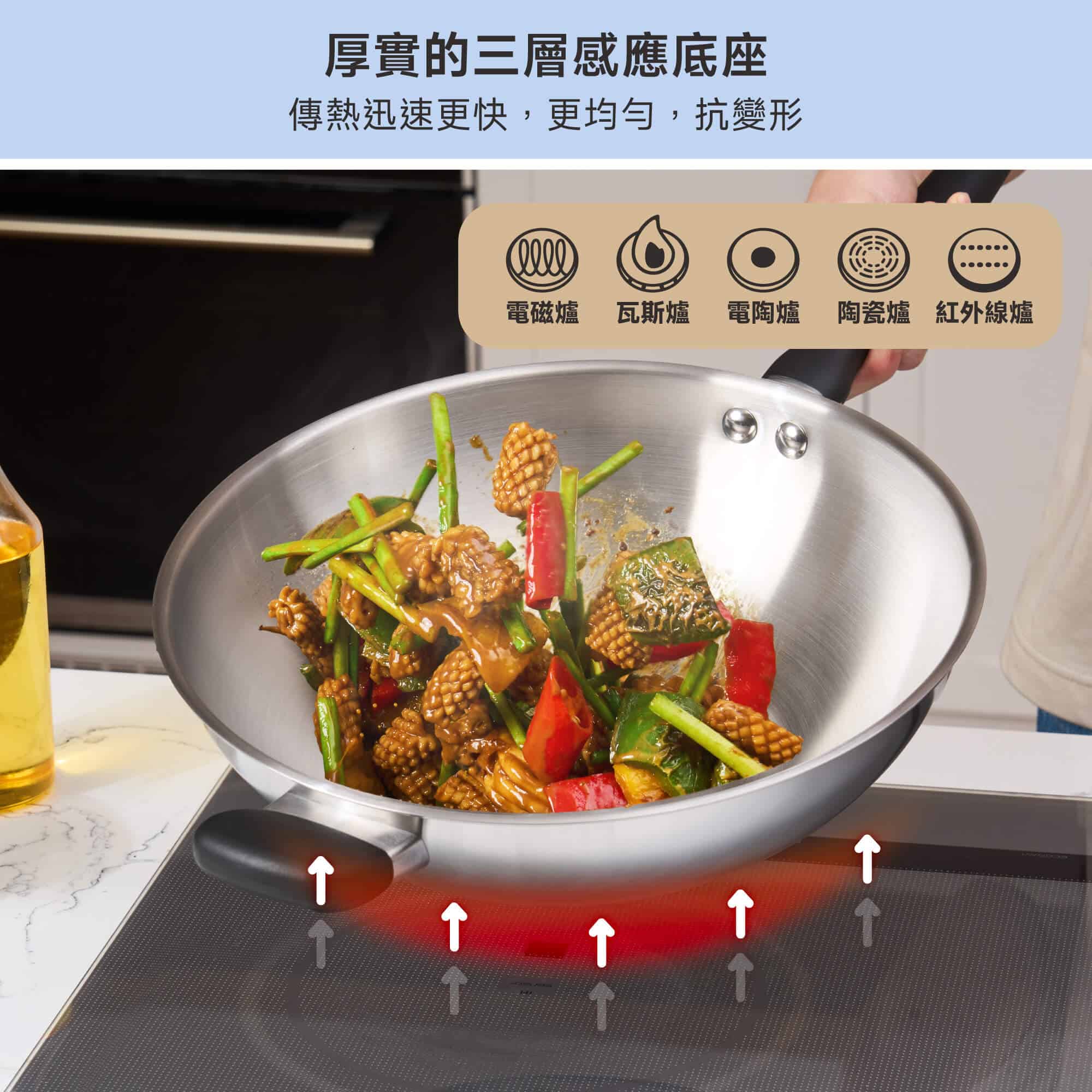 • 全包覆三層感應底座:加熱快速、均勻