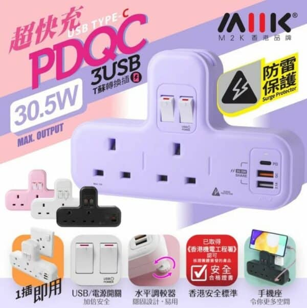 📌將一位電制一插變成 “2個13A三腳插” + USB-C【PD20W】USB-A【QC3.0】 & USB-A【2.1A】