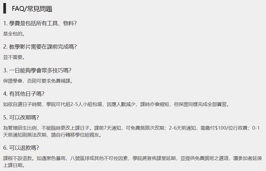 - 課程不設退款。如遇黑色暴雨、八號風球或其他不可控因素,學院將宣佈課堂延期,並提供免費調班之選項,讓參加者延後上課日期。